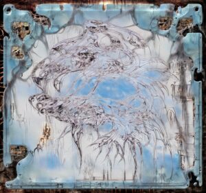 5” read A heart laid on a stone, beyond the slopes, bloodied just enough