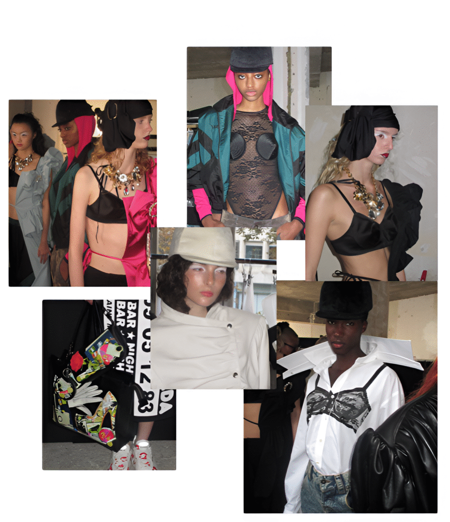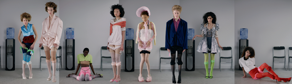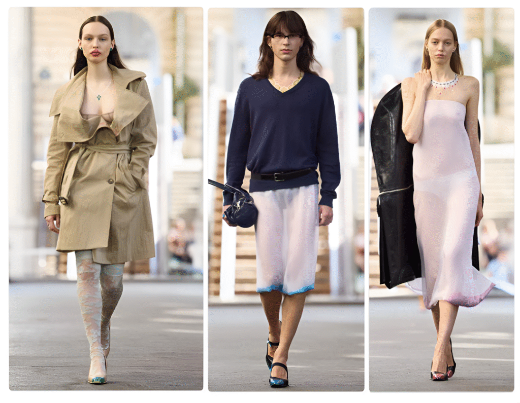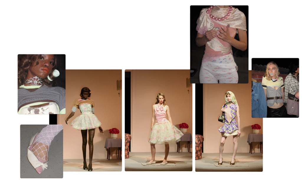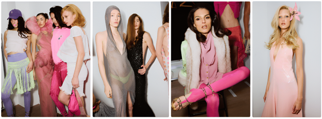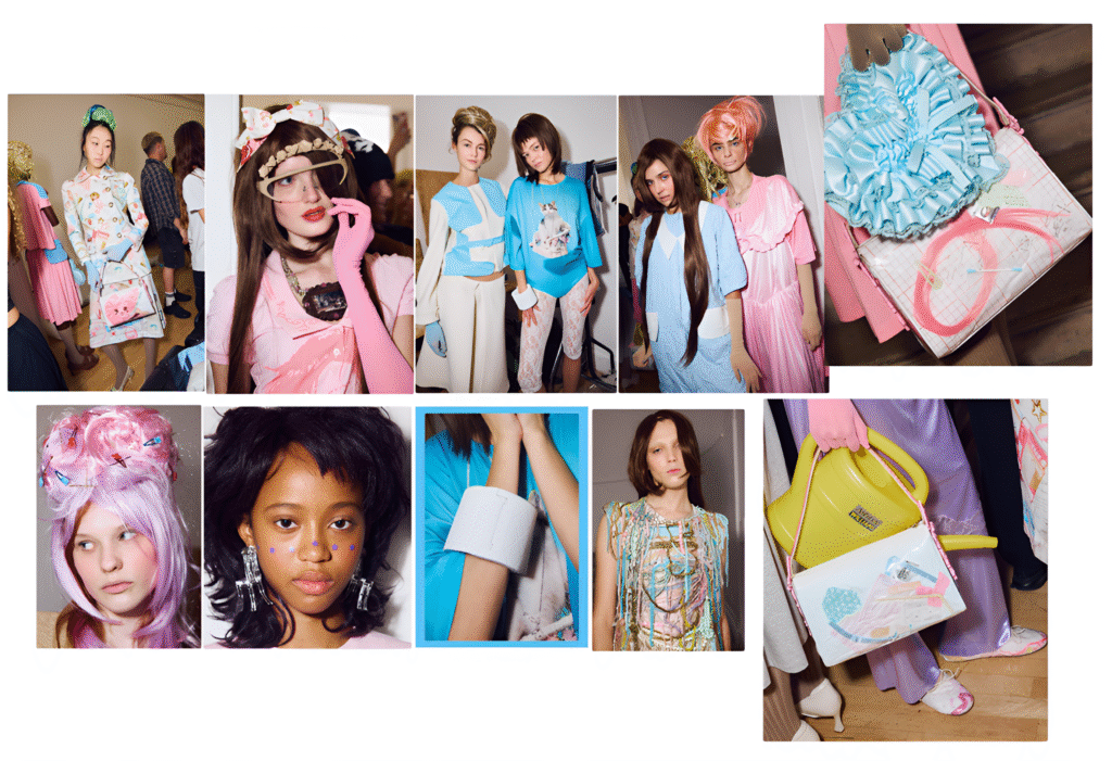 Predictions: the versatility of socks; neon colours; costume dressing; pinks, chiffon, silks, frills, and neon are all coming together to create a new visual language that signifies a “childlike femininity and subtle unease.”; acrylic nails; toddler dressing